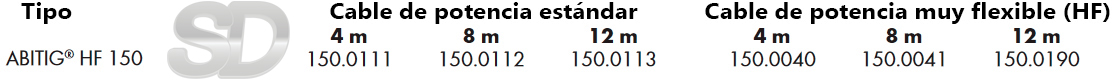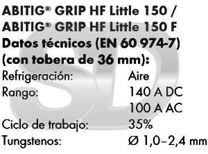 Antorcha refrigerada por aire cuyo diseño evita que el calor de las toberas pase al cuello, protegiendo la antorcha, incrementando su duración y reduciendo costes. La línea de antorchas ABITIG GRIP HF, ofrece un mayor confort en su utilización debido a la posibilidad de integración de diferentes micros de control o función. Asimismo, están aisladas contra la alta frecuencia (HF). Con un ciclo de trabajo del 35%, aporta capacidad para 140A en corriente continua y 100A en alterna. Apta para diámetros de electrodo de 1,0mm a 2,4mm. Disponible en mangueras de 4, 8 y 15 metros.