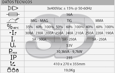 MicroMAG 301 PLUS es un soldador inversor trifásico compacto y robusto para MANUAL MIG / MAG, MMA y TIG Lift. Fácil de llevar, ya que pesa sólo 19 kg, es ideal para el mantenimiento y reparación en el campo, los astilleros y las aplicaciones offshore. El cambio de polaridad permite soldar con alambres tubulares auto blindado. Gracias al sistema de control innovador WECO HAC (Hybrid Control de Arco) de arco MIG / MAG, suave y estable, proporciona cable de excelente calidad y una ausencia casi total de los aerosoles en cualquier condición de trabajo. La interfaz es sencilla y el ajuste intuitiva y precisa mediante el uso de dos mandos. El parámetro Soft Arco encaja el arco y la corriente de soldadura al material a soldar. Los parámetros adicionales son: Motor Slope, Soft Start, Burn Back y Post gas para un encendido arco perfecto y excelente hilo de corte al final de la soldadura. Inductancia es regulable electrónicamente desde el panel frontal y optimiza el arco. La ventilación de túnel protege del polvo y componentes electrónicos salinidad, mejorar el ciclo de vida de MicroMag 301 PLUS. MicroMAG 301 PLUS está equipado con un motor de accionamiento con 4 rodillos que garantiza una perfecta alimentación del alambre. Los electrodos de hasta 5 mm de diámetro en MMA Arc Force y Hot Start ajustable Ascensor MMA Primer TIG DC para reducir las inclusiones de tungsteno