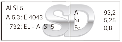 EUROTROD ALSI5 Es un electrodo para aleaciones no férreas, de alumino para la soldadura, reparación y revistimiento de aleaciones de aluminio-silicio con un máximo del 7% Si. Las buenas características de fluidez permiten a este electrodo la soldadura de todas la fundiciones de aluminio (excepto fundiciones AlMg). Está disponible en paquetes en las medidas de 2,5X350 y 3,2X350; así como en formato Blister en medidas de 2.5mm (30 unidades) y 5 3,2nn (20 unidades).