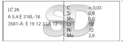 EUROTROD LC26 es un electrodo para la soldadura de aceros inoxidables, con revestimiento de rutilo y bajo contenido de carbono parea soldadura de aceros inoxidables tipo ALSI 316 y 216L. Buena resistencia química a la corrosión. El bajo contenido de carbono aumenta la resistencia a la cororosión intergranular. Resiste a temperaturas hasta 400ºC.