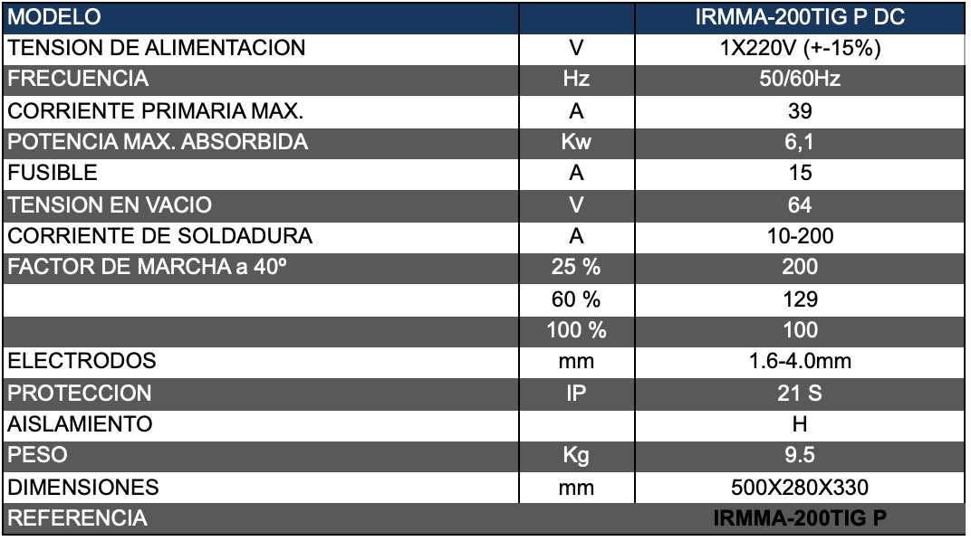 Equipo monofásico con tecnología inverter para soldadura de todo tipo de electrodos y TIG en corriente continua. Soldadura TIG con cebado con por alta frecuencia, 2 tiempos – 4 tiempos, rampa de bajada. Ideales para construcciones metálicas, reparaciones y todo tipo de mantenimientos.