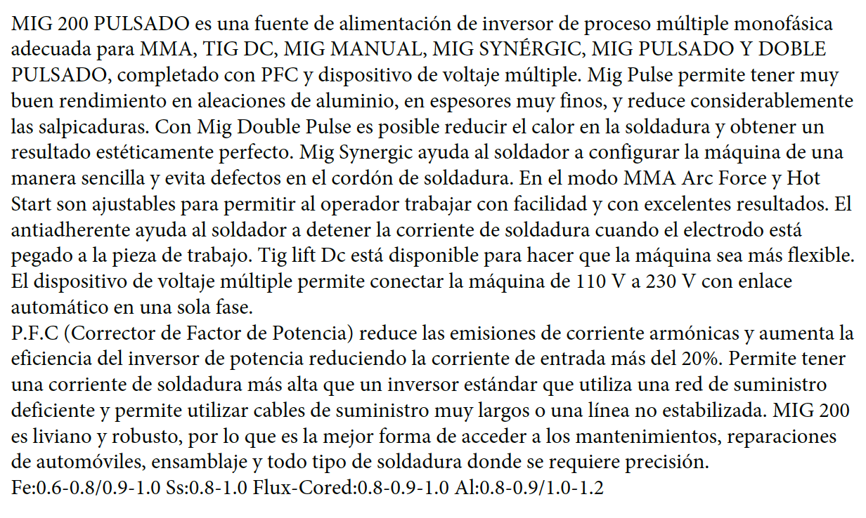 MIG 200 PULSADO es una fuente de alimentación de inversor de proceso múltiple monofásica adecuada para MMA, TIG DC, MIG MANUAL, MIG SYNÉRGIC, MIG PULSADO Y DOBLE PULSADO, completado con PFC y dispositivo de voltaje múltiple. Mig Pulse permite tener muy buen rendimiento en aleaciones de aluminio, en espesores muy finos, y reduce considerablemente las salpicaduras. Con Mig Double Pulse es posible reducir el calor en la soldadura y obtener un resultado estéticamente perfecto. Mig Synergic ayuda al soldador a configurar la máquina de una manera sencilla y evita defectos en el cordón de soldadura. En el modo MMA Arc Force y Hot Start son ajustables para permitir al operador trabajar con facilidad y con excelentes resultados. El antiadherente ayuda al soldador a detener la corriente de soldadura cuando el electrodo está pegado a la pieza de trabajo. Tig lift Dc está disponible para hacer que la máquina sea más flexible. El dispositivo de voltaje múltiple permite conectar la máquina de 110 V a 230 V con enlace automático en una sola fase.
