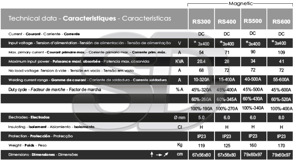 Rectificador trifásico para soldadura MMA DC, con regulación de corriente por inductancia trifásica variable. Soldadura optimizada de todos los tipos de eléctrodos; modelo RS 500 y RS 600 adecuado para corte/chaflanado ARC-AIR. Equipado con toma de 230V 2500W para conexión de herramientas eléctricas manuales, generador de alta frecuencia o economizador TIG. Construcción sólida y robusta con durabilidad comprobada, ideales para talleres de metalurgia media y pesada.