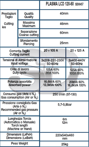 El generador trifásico de inverter para el corte de los metales por plasma de aire comprimido, modelo PLASMA 120-60 INVERTER, se caracteriza por sus dimensiones y peso limitados, la selección automática de la tensión de alimentación en el intervalo: 3×208/220/230V y 400/440V, su facilidad de empleo y una excelente calidad y velocidad de corte. Es adecuado para aplicaciones en la producción industrial y artesanal, sea en automático como en manual. Una interfaz CNC opcional permite una fácil integración con los pantógrafos.