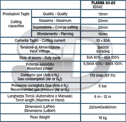 El generador trifásico de inverter para el corte de los metales por plasma de aire comprimido, modelo PLASMA 50-25 INVERTER, se caracteriza por sus dimensiones y peso limitados, su facilidad de empleo y una excelente calidad y velocidad de corte. Es adecuado para aplicaciones en la producción industrial y artesanal, sea en automático como en manual. Una interfaz CNC opcional permite una fácil integración con los pantógrafos.